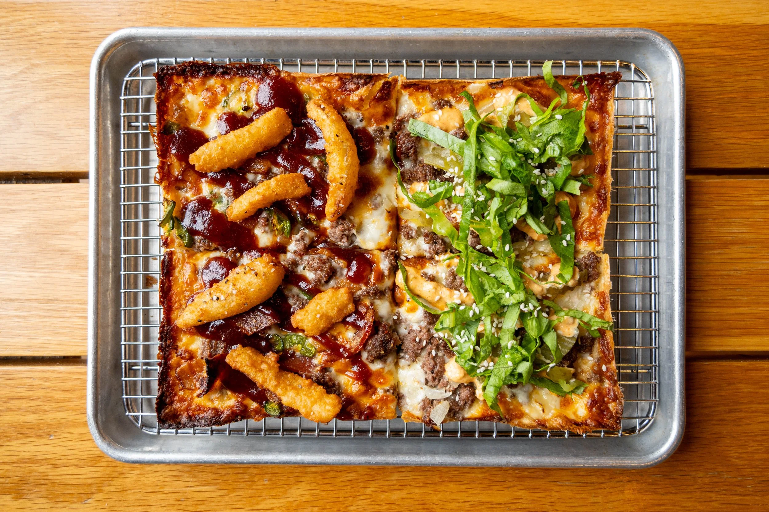 The cowboy side is topped with Wisconsin brick, burger, jalapeños, onion petals, bacon, and drizzled with bbq sauce