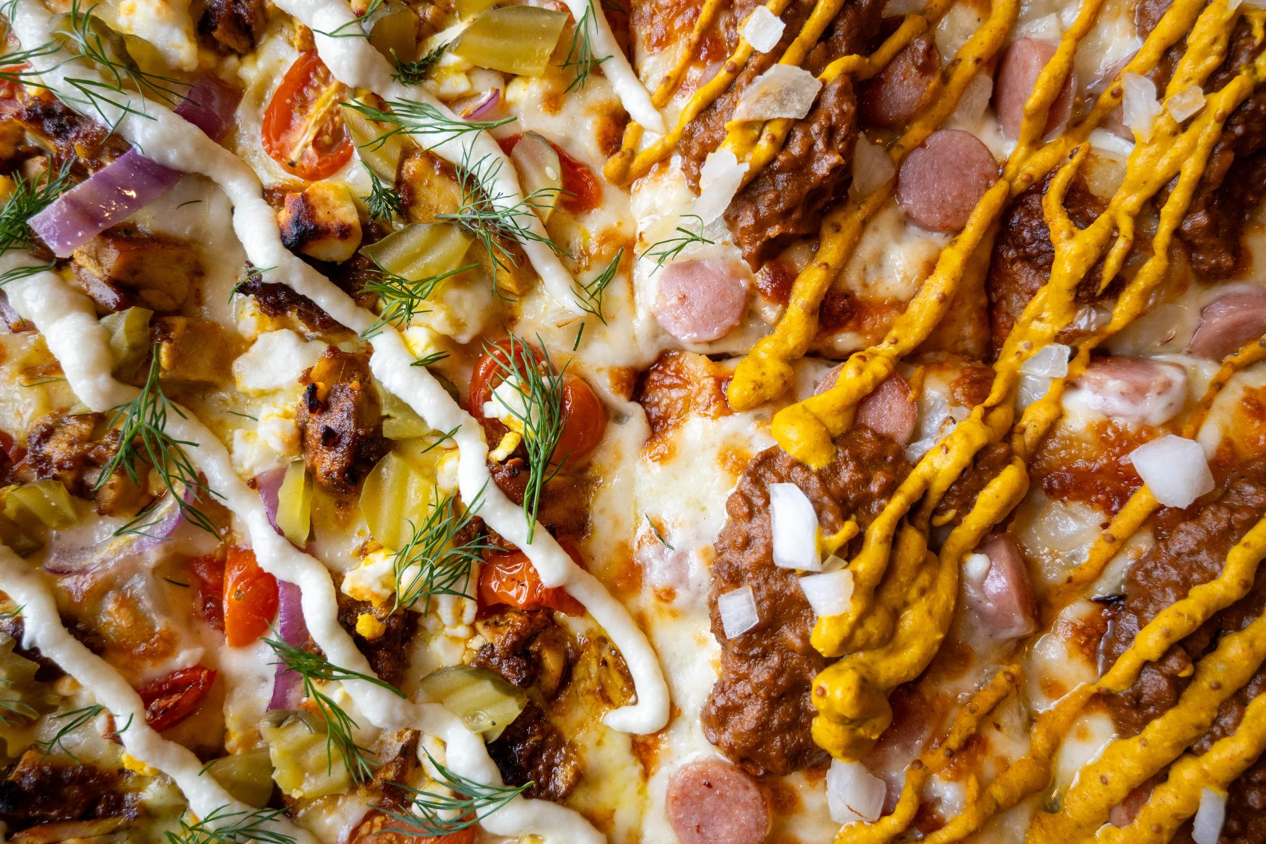The Coney side is loaded with hot dogs, coney style chili, onions and drizzled with mustard.